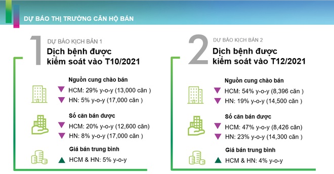 Ở kịch bản thứ 2, việc kiểm soát dịch bệnh phải kéo dài đến cuối năm nay, lượng căn hộ bán ra chỉ còn khoảng 8.400 căn tại TPHCM và 14.500 căn tại Hà Nội, giảm lần lượt là 54% và 19% so với năm trước. Số căn bán ra ở mức tương đương và giá bán dự kiến tăng khoảng 4%.
