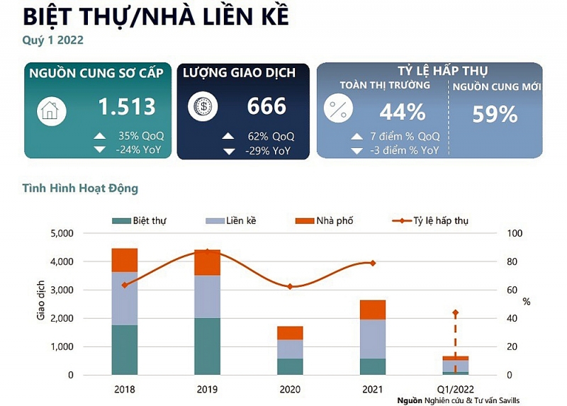 So với quý IV/2021, tình hình hoạt động đã cải thiện, thị trường ghi nhận mức tăng trưởng nhất định về nguồn cung mới, phân bổ đều khắp địa bàn Thành phố Hà Nội. Lượng giao dịch tăng theo quý nhưng vẫn thấp hơn so với cùng kỳ năm ngoái. Nhà liền kề và nhà phố là hai sản phẩm có mức tiêu thụ mạnh nhất trong thị trường.