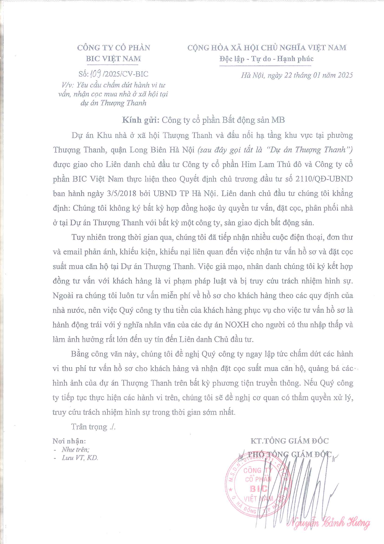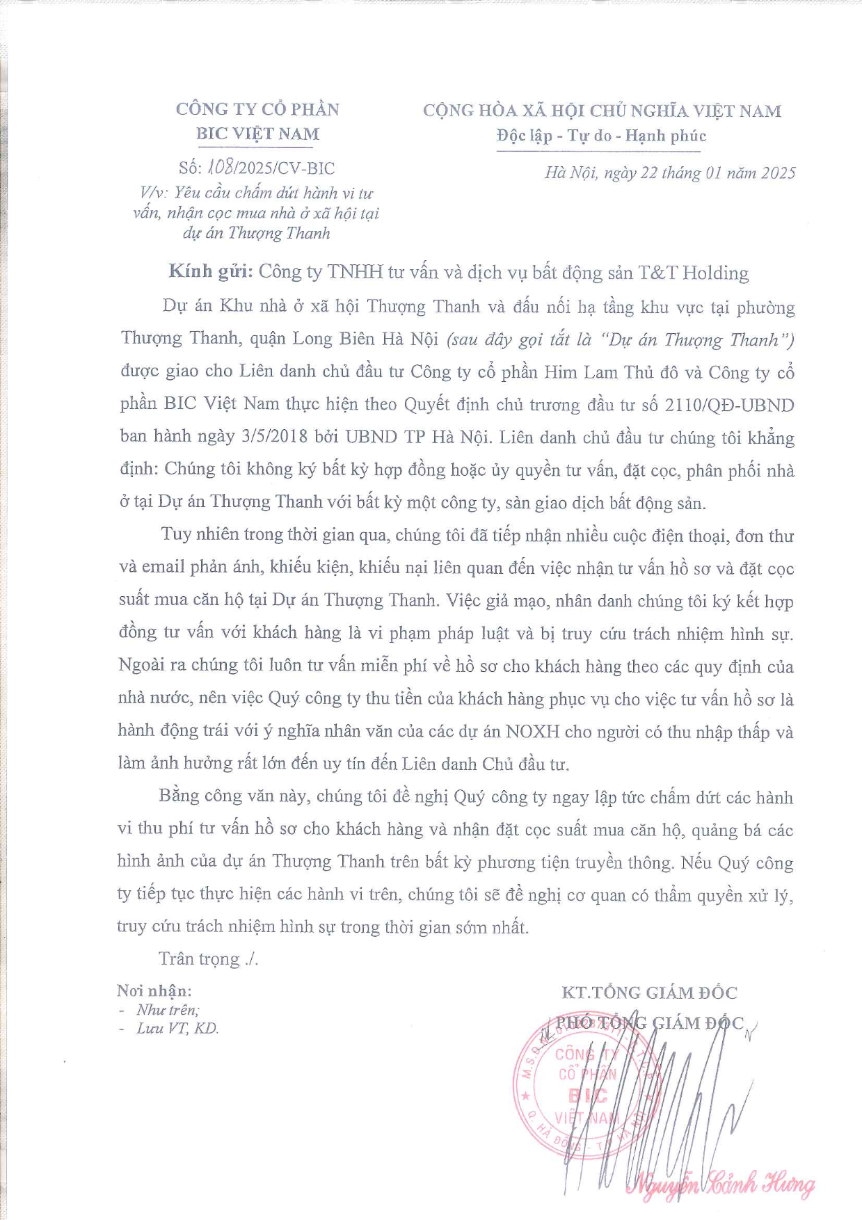 Ngày 24 tháng 1 năm 2025, Công ty Cổ phần BIC Việt Nam đã chính thức phát đi công văn cảnh báo đến các đơn vị và người dân về việc xuất hiện các đơn vị giả mạo website, tự nhận là hợp tác ký kết với công ty nhằm trục lợi từ các chính sách xã hội liên quan đến dự án nhà ở xã hội tại Thượng Thanh, Long Biên, Hà Nội.