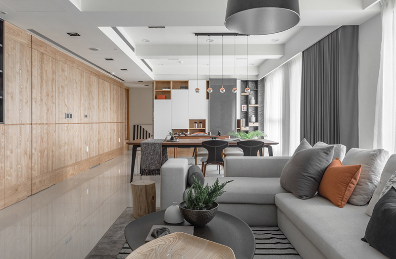 Tất cả đồ đạc đều được giấu phía sau tủ âm tường bằng gỗ trong phòng khách, căn phòng chỉ còn lại những đồ vật cần thiết cho nhu cầu sử dụng hàng ngày.