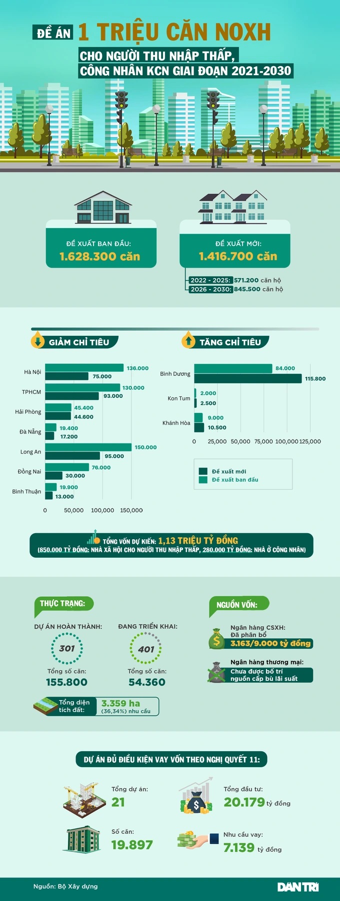 (Dân trí) - Bộ Xây dựng đề xuất tạo điều kiện cho doanh nghiệp huy động khoảng 1,13 triệu tỷ đồng để xây hơn 1,4 triệu căn nhà ở xã hội, nhà cho công nhân giai đoạn 2021-2030.
